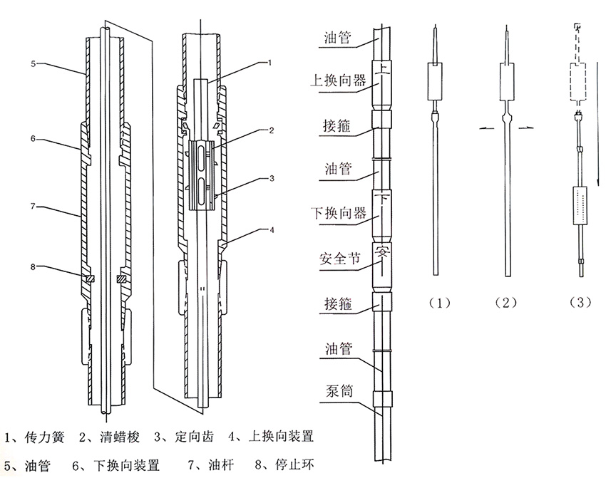下控制部分,一般自然連接在最低結(jié)蠟層以下200米左右的油管上。它的功能是阻止泵桿上的清蠟梭由此再往下行,當(dāng)清蠟梭停止在下控制體內(nèi)的時候,還能使清蠟梭倒換行進方向,向上行走,這樣往復(fù)循環(huán)達到清蠟梭連續(xù)工作的目的。
